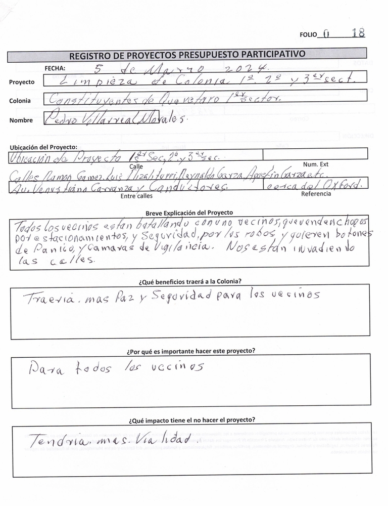 Origen: {"body":{"es":"<p><strong>Folio: 018</strong></p><p><strong>Secretaria - </strong>Seguridad.</p><p><strong>Título: </strong>Limpieza de colonia 1°, 2° y 3° sector.</p><p><strong>Colonia: </strong>Constituyentes de Querétaro 1° sector.</p><p><strong>Nombre: </strong>Pedro Villarreal Morales.</p><p><strong>Ubicación: </strong>Calles: Ramón Gámez, Luis Ilizaliturri, Reynaldo Garza, Agustín Garza, etc. entre Av. Venustiano Carranza y Conductores (cerca del Oxford).</p><p><strong>Breve Explicación:</strong> Todos los vecinos están batallando con un vecino que vende chopos por estacionamientos y seguridad por los robos y quieren botones de pánico y cámara de vigilancia. Nos están invadiendo las calles.</p><p><strong>¿Qué beneficios traerá a la colonia? </strong>Traería más paz y seguridad para los vecinos.&nbsp;</p><p><strong>¿Por qué es Importante hacer este proyecto?</strong> Es importante para todos los vecinos, tendría más vialidad.</p><p><strong>¿Qué Impacto tiene el no hacer el proyecto?</strong></p><p>&nbsp;<strong>Costo: </strong>$3,654,000.00</p>"},"title":{"es":"Limpieza de colonia 1°, 2° y 3° sector."}}