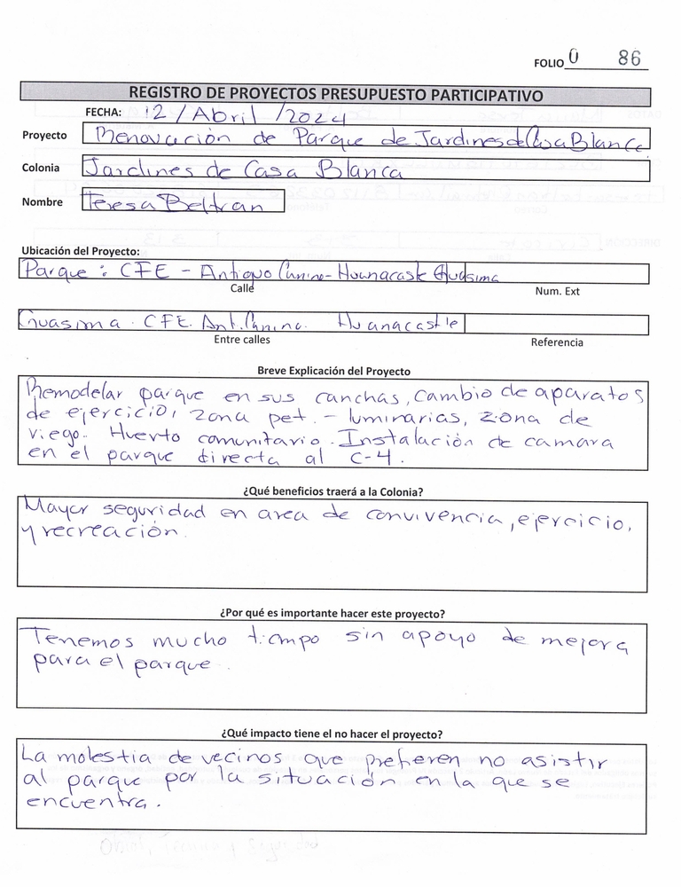 Origen: {"body":{"es":"<p><strong>Folio: 086</strong></p><p><strong>Secretaria - </strong>Obras Publicas y Seguridad.</p><p><strong>Título: </strong>Renovación de Parque de Jardines de Casa Blanca.</p><p><strong>Colonia: </strong>Jardines de Casa Blanca 1° sector.</p><p><strong>Nombre: </strong>María Teresa Beltrán Zúñiga</p><p><strong>Ubicación: </strong>C.F.E., Antiguo Camino&nbsp;a Apodaca, Huanacastle y Guasima</p><p><strong>Breve Explicación:</strong> Remodelar parque en sus canchas, cambio de aparatos de ejercicio, zona pet, luminarias, zona de&nbsp;riego, huerto comunitario, instalación de cámara en el parque directa al C-4. (huerto comunitario NO factible).</p><p><strong>¿Qué beneficios traerá a la colonia? </strong>Mayor seguridad en área de convivencia , ejercicio y recreación.</p><p><strong>¿Por qué es Importante hacer este proyecto?</strong> Tenemos mucho tiempo sin apoyo de mejora para el parque.</p><p><strong>¿Qué Impacto tiene el no hacer el proyecto?</strong> La molestia de vecinos que prefieren no asistir al parque por la situación en la que se encuentra.</p><p>&nbsp;<strong>Costo:</strong> &nbsp;$&nbsp;&nbsp;3,225,728.08&nbsp;</p>"},"title":{"es":"Renovación del Parque de Jardines de Casa Blanca. "}}