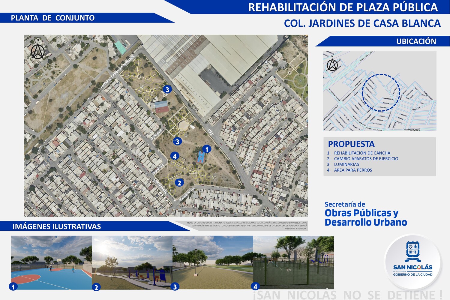 Breve Explicación: Remodelar parque en sus canchas, cambio de aparatos de ejercicio, zona pet, luminarias, zona de riego, huerto comunitario, instalación de cámara en el parque directa al C-4. (huerto comunitario NO factible).